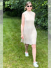 Elegantes Strickkleid in A-Linie mit angedeutetem Stehkragen und Plissee-Optik.