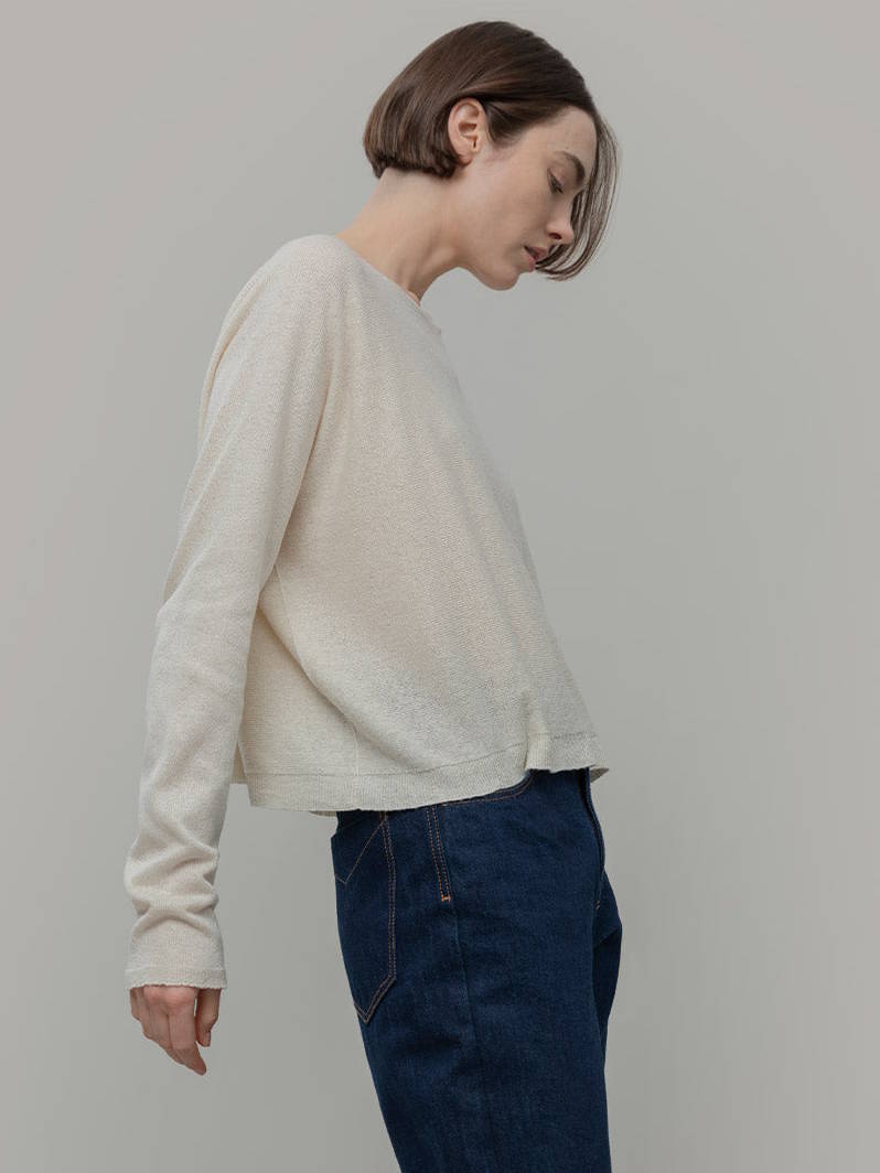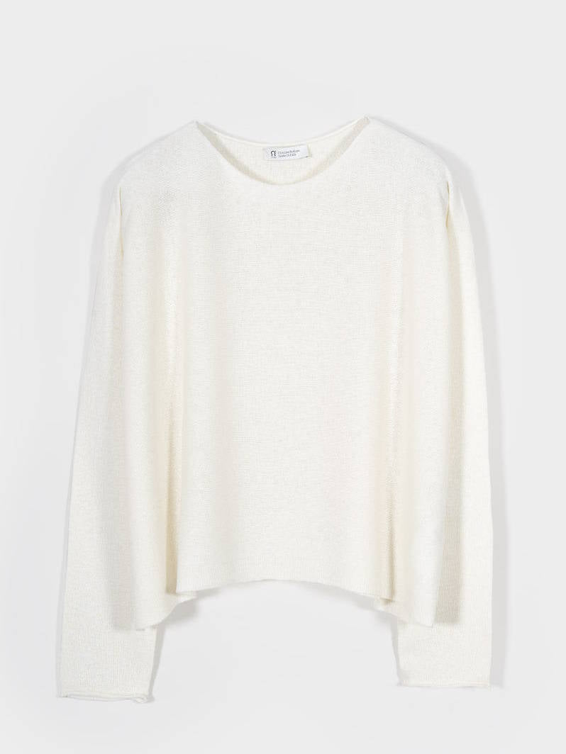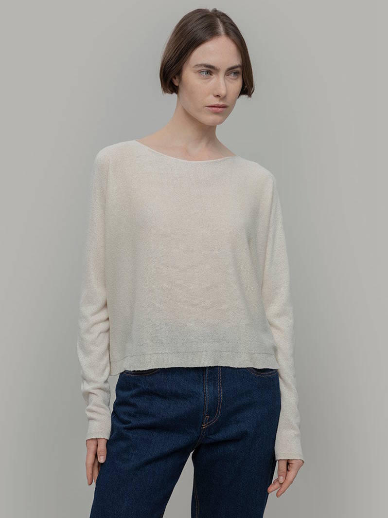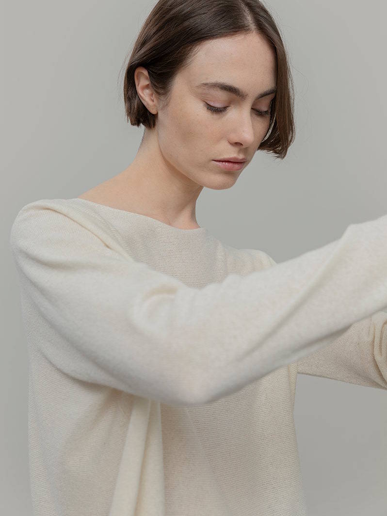 Zarter Oversize-Pullover mit U-Boot-Ausschnitt aus recycelter Seide in Feinstrickqualität.